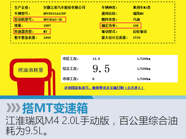 从新车燃油消耗数据来看,瑞风M4将搭载型号为HFC4GA3-3D的2.0L自然吸气发动机,匹配5MT或6MT两种形式的变速箱,百公里综合油耗为9.5L。值得一提的是,这款发动机目前已在帅铃T6上搭载,其额定功率108kW,峰值扭矩达190Nm。