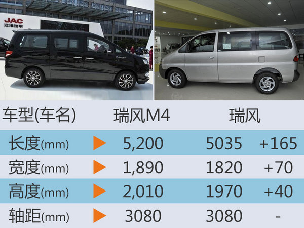 江淮瑞风M4在在尺寸上,相比瑞风具有很大优势,瑞风M4长宽高分别为5,200*1,890*2,010mm,轴距3,080mm。现款瑞风尺寸5035*1820*1970mm,轴距3080mm。通过对比可知,瑞风M4除轴距与瑞风一致外,其它尺寸均有不同程度的升级,也是具有较大的竞争力度的。