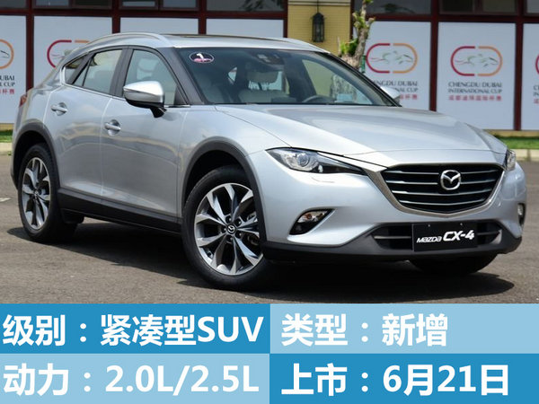 马自达CX-4于今年北京车展全球首发亮相,新车定位为一款紧凑型SUV,在外观方面沿用了KOERU越概念车与“魂动”设计的理念。该车长宽高为4,633*1,840*1,535毫米,轴距为2,700毫米,与CX-5轴距相同,高度降低175毫米。动力方面搭载2.0升和2.5升两款“创驰蓝天”自然吸气发动机,与之匹配6速手动变速箱和一台6速手自一体变速箱。