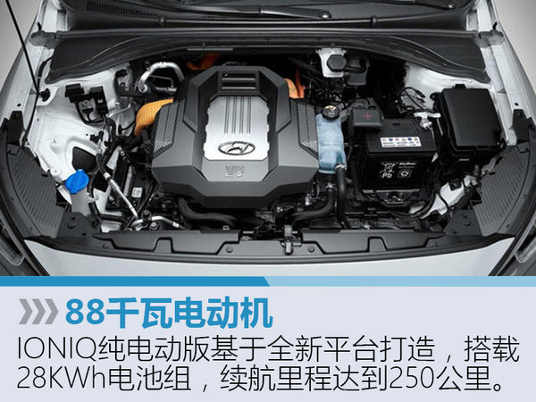 现代IONIQ纯电动版基于全新平台打造,配备一台88千瓦电动机,可推动车辆至极速150公里/小时。新车搭载由LG生产的28千瓦时锂电池组,安装在后座椅下方,其续航里程达到250公里。北京现代规划到2020年将推出9款新能源产品,目前第九代第九代索纳塔混合动力车型已经正式推出,明年上半年还将推出第九代索纳塔插电混动版,加上下半年推出的纯电动轿车,北京现代旗下新能源产品进一步完善。