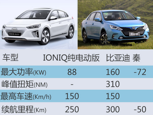 目前在纯电动车市场中,合资车企还未推出纯电动车型,市面上大多为自主品牌纯电动车。比亚迪较早之前已经推出了纯电动车型比亚迪秦,电动机最大功率为160千瓦,续航里程可达到300公里,最高车速为150公里每小时。北京现代纯电动车上市后将与其展开竞争。