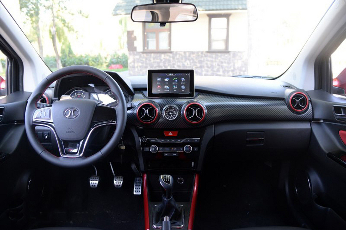 内饰方面:新车方向盘、空调出风口和中控大屏幕等都与奔驰车型接近。但绅宝X25也有自己出彩的地方,譬如红黑双色内饰,真皮方向盘红色缝线,中控面板碳纤维纹路,铝合金踏板等都令新车显得更有运动气息。
