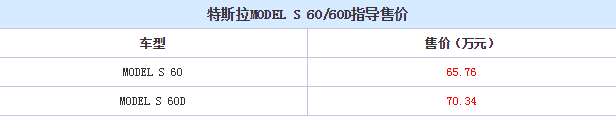 MODEL S 60系列新车搭载60kWh电池组,其中MODEL S 60车型采用后轮驱动,NEDC工况(New European Driving Cycle,新欧洲行驶工况)下续航可达480km,0-100km/h加速为5.8秒,极速为210km/h。MODEL S 60D车型采用四轮驱动,NEDC工况下续航可达490km,0-100km/h加速为5.4秒,极速为210km/h。