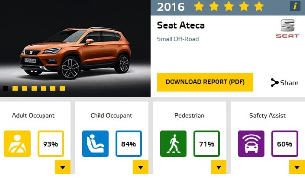 西雅特Ateca是一款与大众新Tiguan同平台的紧凑型SUV,该车在本次测试中同样获得了五星的最高评价。从碰撞结果来看,西雅特Ateca在正面偏置碰撞和正面宽屏碰撞发生后,其车身结构保持良好,车身整体结构及A柱并未发生明显变形。由于该车标配有前部预防碰撞系统,对于避免并减轻低速事故贡献较大。