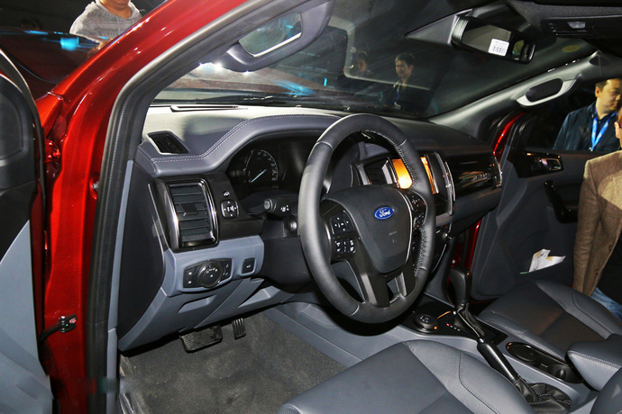 外观方面:前段时间我们的同事已经参与过福特撼路者的试驾活动。由于撼路者是基于Range皮卡改进而来,所以外观方面相当粗犷豪放,车身尺寸长宽高分别为4892mm/1862mm/1837mm,轴距达到了 2850mm。前脸部分采用六边形前进气格栅的家族式设计风格,并且用大面积粗线条的镀铬进行装饰,两端为内嵌式大灯,与前格栅相连。保险杠底部的银色饰板延伸到两侧雾灯处,提升了一定的层次感。车身侧面线条非常简单,但225mm的离地间隙、29°的接近角、21°的通过角和25°的离去角,证明了撼路者有极其强大的通过性。