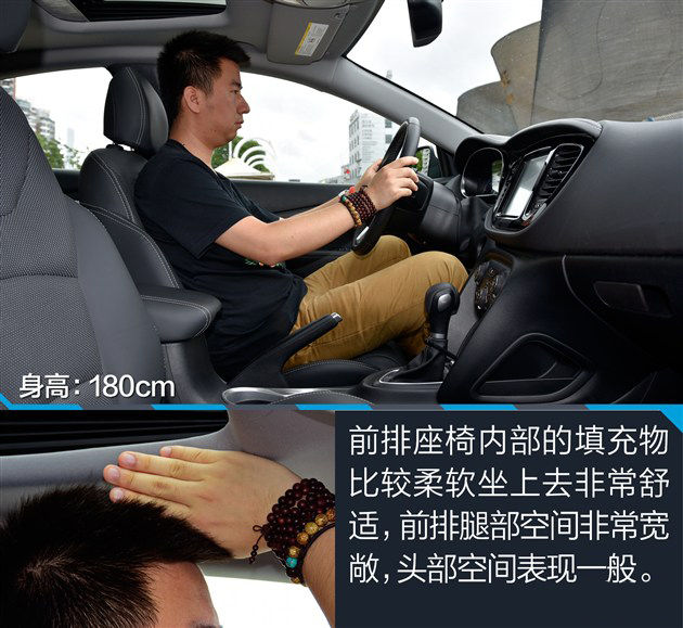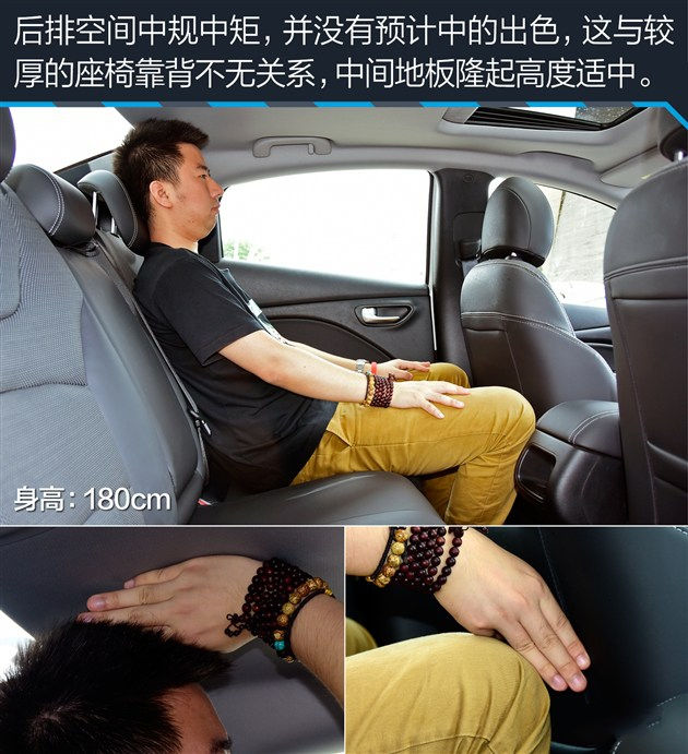 身高180cm的体验者在调整到适合自己的坐姿后,可以获得四指左右的头部空间。而保持前排座椅不动,体验者移至后排后,可以获得三指左右的头部空间以及三指左右的腿部空间,整体乘坐空间能够满足日常使用的需求。