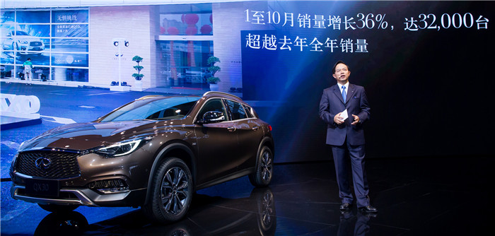 东风英菲尼迪总经理戴雷博士(Dr. Daniel Kirchert)表示:“今年以来,英菲尼迪本土化战略持续深化,通过反映‘人文精神’,并且覆盖产品、品牌、网络、服务和企业社会责任等方面的‘敢爱全体验’平台让品牌精神全面落地。当前整个中国豪华车市场都面临挑战,而QX30的推出将为英菲尼迪的逆势增长注入新的动力,并助推品牌实力达到新的高度。”
