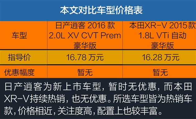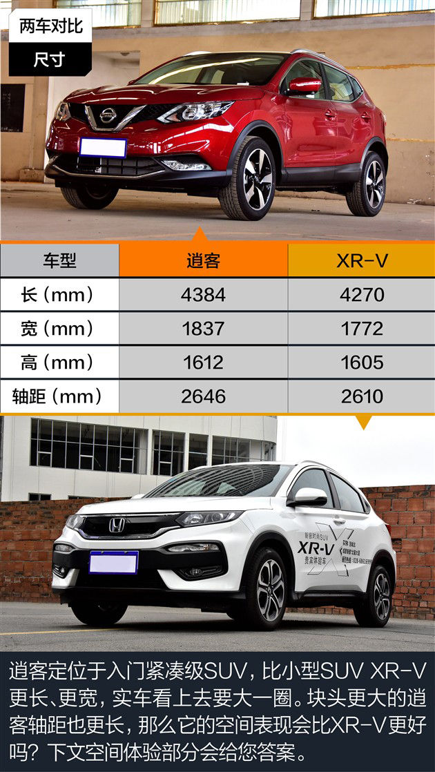 年轻人喜欢时尚精致的小型SUV,而近几个月本田XR-V稳坐合资小型SUV的销量冠军,这说明消费者对这款车的认可。最近上市的入门紧凑级SUV日产逍客,凭借跨级的车身尺寸以及不俗的实力,与相近价格区间的XR-V约战在所难免。下面我们就来看看两车各方面的表现,看看谁才是心水之选。