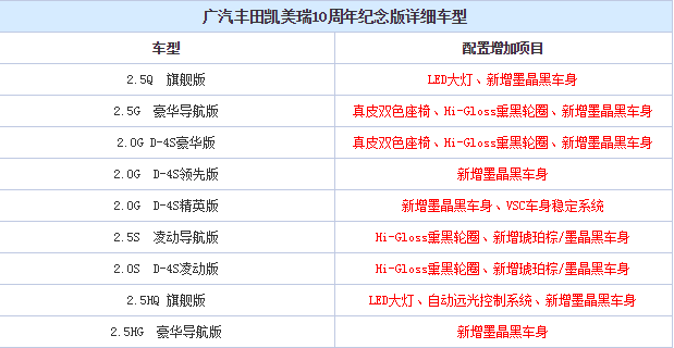 动力方面,凯美瑞10周年纪念版仍采用2.0L和2.5L自然吸气发动机,传动系统采用6速自动变速箱。