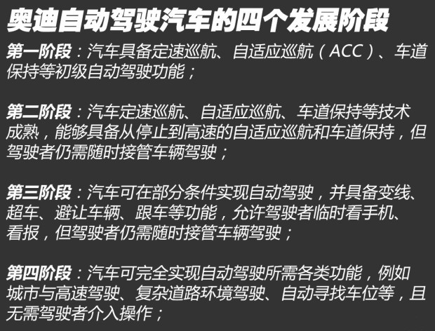 奥迪自动驾驶汽车共分为四个发展阶段,其中第三阶段自动驾驶系统为可实现并线超车、避让车辆、跟车等功能,并允许驾驶者临时看手机,但仍需随时接管车辆驾驶。之所以全新A8配备第三阶段自动驾驶模式,也是由于目前自动驾驶技术相对不够成熟,避免出现更多问题。