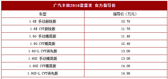 广汽丰田公布了2016款雷凌车型的官方指导价,新车相比目前在售车型,在车型及配置方面有所调整。