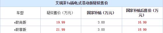 艾瑞泽7e插电式混动版将会推出e致尚版和e致享版两款车型,根据目前的国家补贴情况,这款车将能够获得3万元的国家新能源补贴,而地方补贴则根据各地具体情况而定。