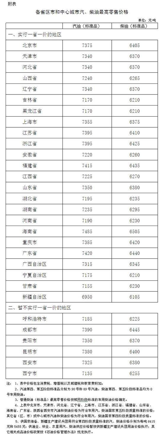 附:各省区市和中心城市汽、柴油最高零售价格表