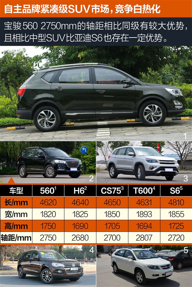 与现阶段国内自主品牌月销量排行第2的MPV车型宝骏730同平台,并拥有相同的2750mm轴距,这让560的车内乘坐空间成为了其自身的最大优势。相比同为紧凑级SUV的哈弗H6和长安CS75,宝骏560的轴距拥有较大优势。就算与中型SUV众泰T600和比亚迪S6相比,也不是完全没有优势。从国内市场对于空间的需求来看,宝骏560给同级造成了相当大的杀伤力。