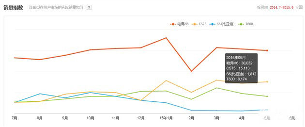 此外,在自主品牌销量指数中还可以论证宝骏560的“刺客”身份。从2014年7月至2015年5月的销量走势来看,一直处于销量大幅领先的哈弗H6在2015年初出现了严重的下滑,虽有回弹但至今仍处于下滑趋势。而CS75和众泰T600以及比亚迪S6从2015年第一季度后也开始逐渐下滑。在自主品牌SUV市场纷纷销量下滑之时,宝骏560的正式上市,给了上述四款车型背后一击。而这背后一击则是宝骏560上市当天订单破万,相比宝骏730上市5天订单达到13000台来看,宝骏560的“粉丝”出手速度更恐怖。
