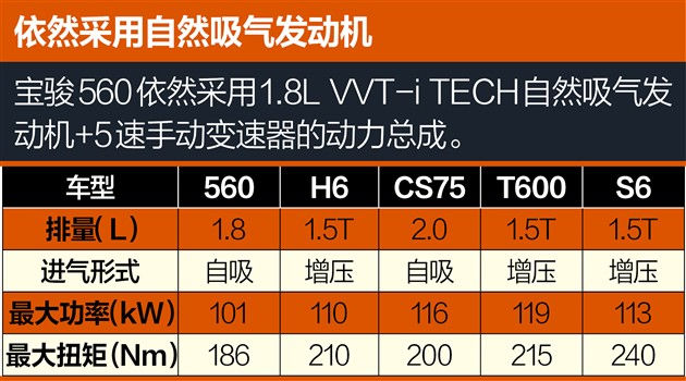 宝骏560直接照搬了宝骏730上的动力总成,相比同价位的竞争对手来看,1.8L的自然吸气发动机,少了一些驾驶乐趣。且现阶段也仅推出了手动挡车型。除了动力部分,宝骏560照搬了宝骏730的前麦弗逊式/后扭转梁式非独立悬架,而其他四位竞争对手则均采用了多连杆或双横臂式独立悬架。相比之下,宝骏560后排乘客的舒适性会差一些。