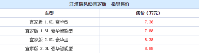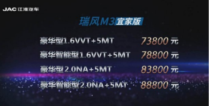 天翼汽车讯 近日,江淮汽车正式推出了瑞风M3宜家版,据悉,该款新车共推出两个排量的车型,分别为1.6L和2.0L,而新车的售价也随之而出,定位在7.38-8.88万元。
