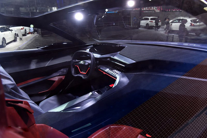 外观方面:采用剪刀门设计,前脸红黑间隔的网状格栅符合标致最新的家族式设计理念,两侧LED前大灯样式较窄,内部带有LED日间行车灯。新车前保险杠的造型更彰显了其凶猛的一面,尾部独特的后扰流板造型与尾灯样式也十分新颖。