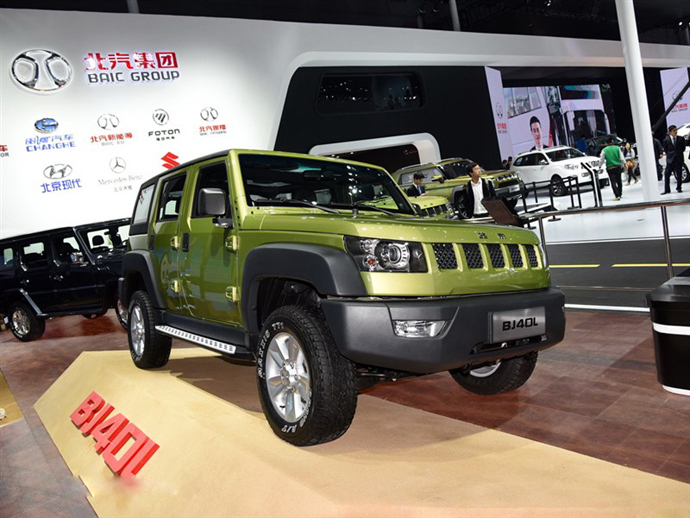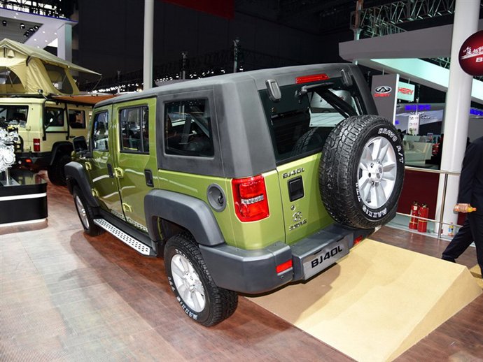 外观方面:新车线条平直,造型非常硬朗,黑色的外观套件装饰使这款车富有较强的越野气息。作为五门版车型,北京40L的轴距较北京40车型有所加长,在尾部则标有“BJ40L”标识。