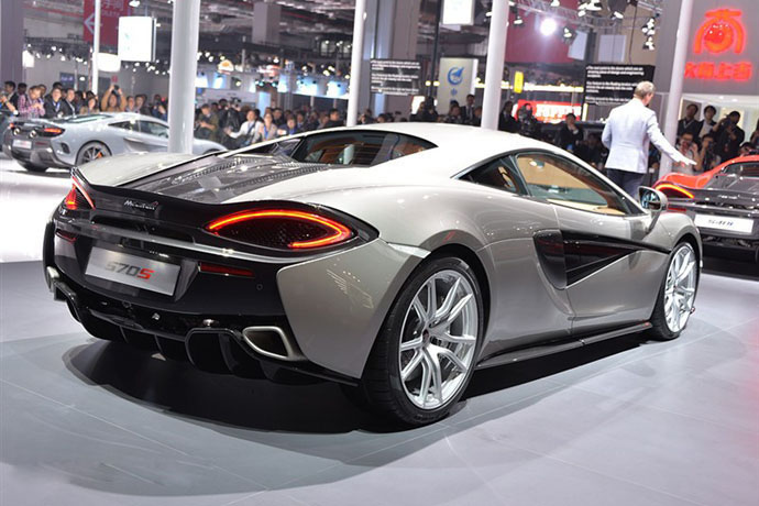 外观方面:该款车型采用了迈凯伦家族式的前脸设计,车身采用双色涂装,在前唇、侧裙、后扩散器等多处都使用了碳纤维材料进行打造。新车采用了“剪刀门”设计,在车尾采用了双边共两出多边形进气口。此外,新车尾灯采用LED灯组,造型十分个性。