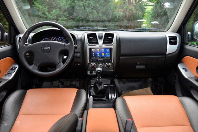 外观方面:新车在外观方面与宝典PLUS车型基本保持一致。前脸采用X型设计,双横幅的镀铬饰条内嵌入了JMC的品牌LOGO。大灯造型方正,并采用远近光分体式设计。车尾的造型相对平庸,设计也有些保守。长货厢的货厢尺寸为:1830×1470×470mm。