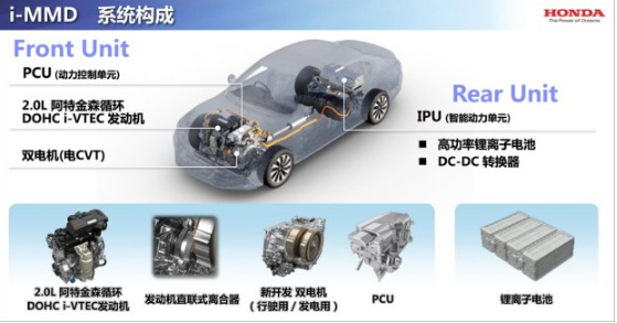 本田SPORT HYBRID(锐·混动)混合动力系统即本田i-MMD系统,该系统由2.0L阿特金森循环自然吸气发动机、双电机、“电CVT”变速箱、动力控制单元以及锂电池组成,其可以实现在纯电动、混合动力和发动机直驱三种模式之间进行无缝切换。搭配这套混动系统的雅阁混动版车型的官方油耗成绩为4.2L/100km。