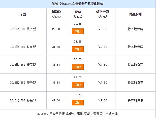 天翼汽车讯,7月27日,记者从北京达世行华威凯迪拉克4S店知道了对于这次新车上市的价格优惠,凯迪拉克ATS-L全车系的优惠是多少呢,这次的越享版24万起,这次正式购买的客户可以享受更多的优惠和政策,对这个品牌的车感兴趣的朋友不妨可以电话咨询详情请见下表: