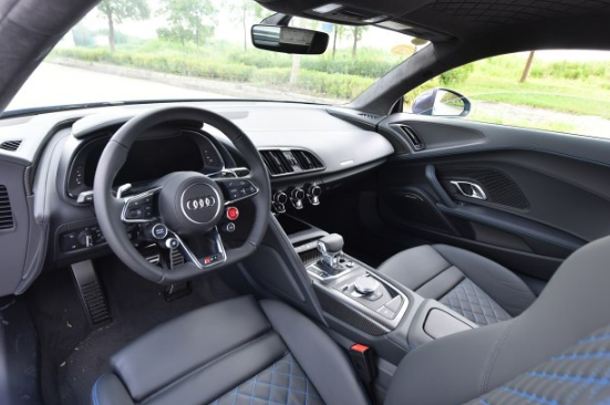 内饰方面的改动比外观更明显,方向盘后方一块12.3英寸的全液晶仪表盘取代了现款车型上中控台的液晶大屏,并且中控台采用了上下分层的设计。配置方面,全新R8 V10 Coupe Performance的配置相比较现款整体来说有所提升,增添了激光远光灯、无钥匙进入和启动系统、导航系统、电子驻车、陶瓷通风刹车盘等;但可变悬架由标配改为了选装。