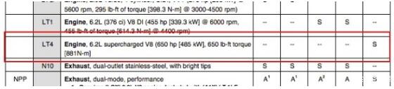 这款车搭载的是6.2L机械增压V8 LT4发动机,新车发布时,雪佛兰官方公布的这款车最大功率达到649马力,峰值扭矩868牛·米。最新的配置表来看,在这几个月中雪佛兰的工程师对这款发动机进行了重新调校,上市车型的最大功率将提升11马力,峰值扭矩将提升13牛·米,最终的最大功率为660马力(485kW)峰值扭矩为881牛·米。在传动系统部分,其将搭载10速自动变速箱。