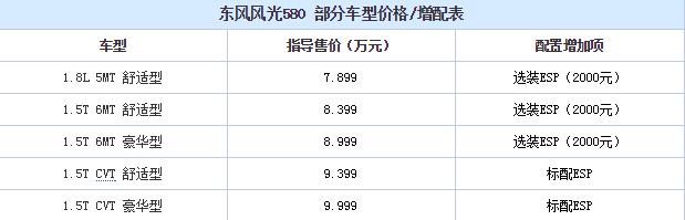 本次推出的东风风光580两款自动挡车型新增标配车身稳定控制系统,1.8L手动舒适型、1.5T手动舒适型和1.5T手动豪华型为选装车身稳定控制系统,选装价格为2000元。据悉,本次东风风光580部分车型增加的ESP车身稳定控制系统为博世提供的最新版本,系统内集成有ABS+EBD、车身动态控制、牵引力控制、刹车辅助、上坡辅助以及防侧翻功能。