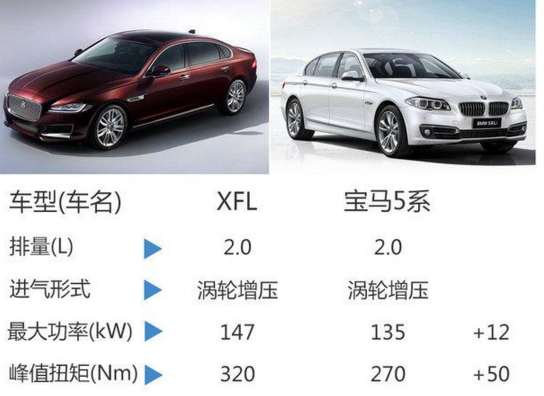 这款全新的捷豹XFL的配置是2.0T的低功率版发动机,车子的足底啊功率可以达到147kW,峰值扭矩为320Nm,和宝马三系相比有一定的优势,主要是在动力输出上更占优势。