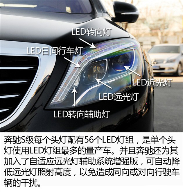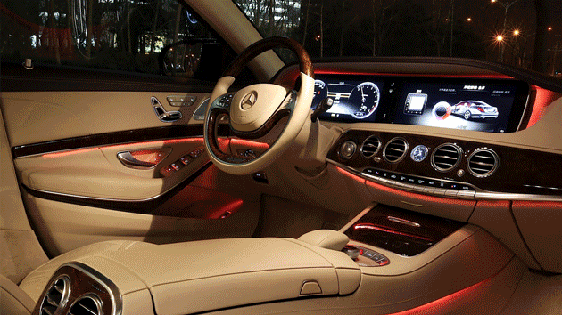 在营造车内饰氛围的上,奔驰也为新S级做足了功课。通过车内灯光颜色的变化,营造出或温馨或激情或惬意或浪漫的氛围。这些原本是生性浪漫的法国车上爱玩的把戏,如今却出现在最具有典型德国严谨基因的奔驰车体内,还真让我吃了一惊。而更让我惊讶的是,它居然有7种内饰氛围灯!