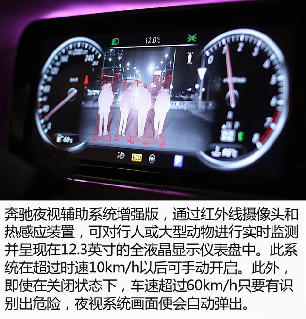 说完奔驰S级看得见的车灯技术,下面让我们再来说几个不轻易看到,但用到就根本停不下来的科技创新配置。首先便是夜视系统。其实这对于豪华汽车来说绝对是必不可少的环节。