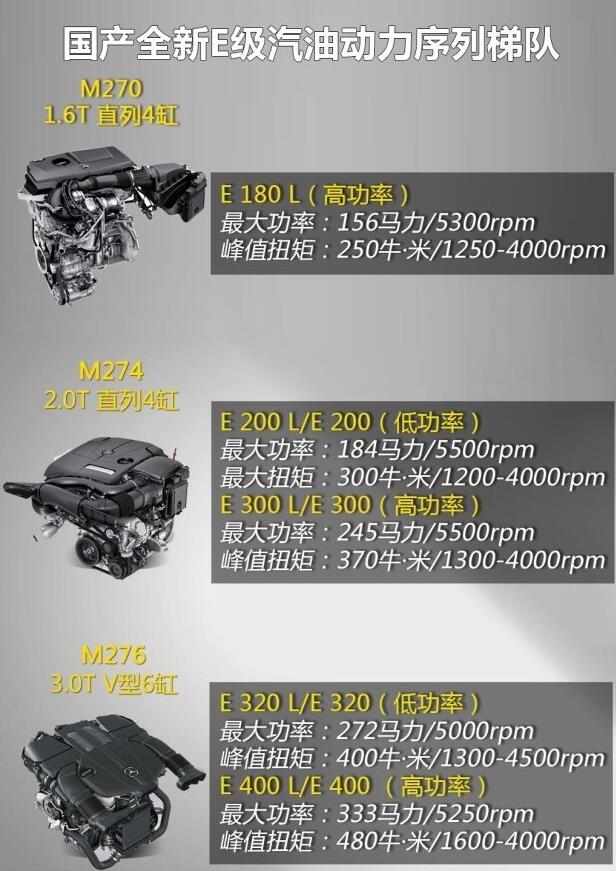 动力方面,E 180 L搭载的是1.6T发动机,该发动机的最大功率为156马力;E 200 L搭载的是低功率版2.0T发动机,它的最大功率为184马力;E 300 L搭载的是高功率版2.0T发动机,最大功率为245马力。
