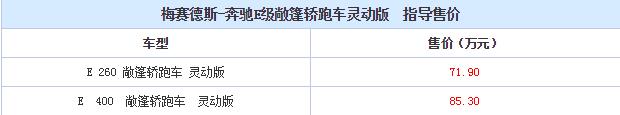 天翼汽车讯 近日,奔驰官方公布了最新消息,梅赛德斯-奔驰E级敞篷轿跑车新增两款车型,这两款新车型分别是E 260敞篷轿跑车灵动版和E 400敞篷轿跑车灵动版,而这两款新车的售价也一并曝光,分别是71.9万元和85.3万元。