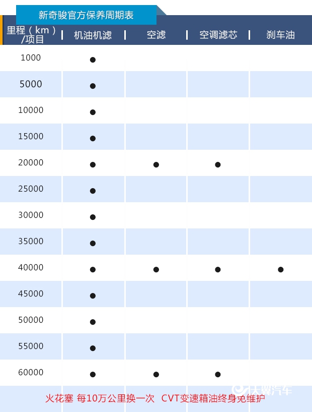 在正常情况下,新奇骏的发动机链条正时系统、电动助力转向系统、燃油滤芯、变速器油和差速器油为终身免维护,所以更换的配件也就非常少了。除了2万公里更换空调和空气滤芯外,就是4万公里更换制动液,而火花塞的更换周期长达10万公里。