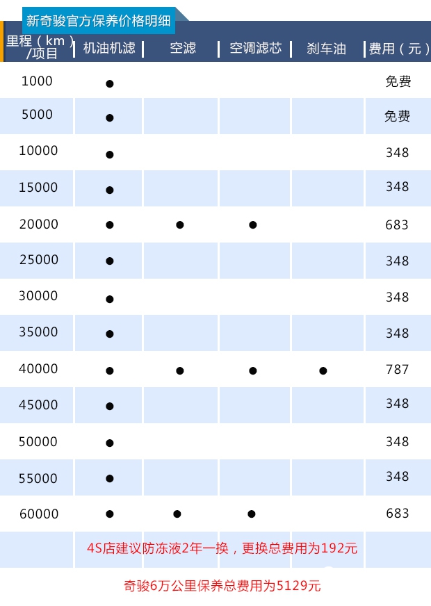 从上表可以得知,奇骏的小保养为348元,20000公里和60000公里除了小保养还要更换空滤和空调滤芯,保养费用为683元;而40000公里还需要更换刹车油,保养费用为787元。由于防冻液4S店建议2年一换,我们按1年行驶20000公里来算,60000万公里内需要更换一次防冻液,费用为192元,那么,60000公里保养总费用为5129元。