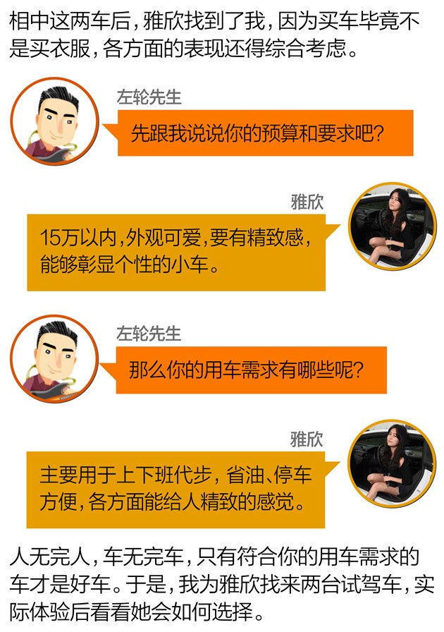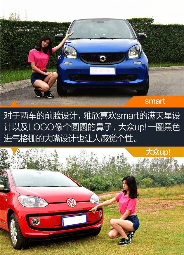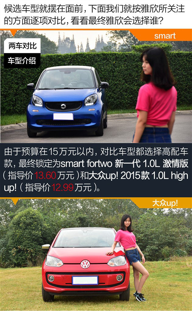 今天的主角妹子雅欣。腿长,爱时尚,有活力,有自己的朋友圈子。步入职场一段时间,家里给了些“赞助”。她准备买一辆精致、个性的情趣小车用于代步。15万以内的预算就将MINI、甲壳虫等车型排除,在这个预算区间能买到称得上精致的个性小车很少,最终她将目光锁定在全新smart以及大众up!上,这便开始了她的选车故事↓