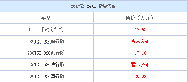天翼汽车讯 9月20日,上汽大众斯柯达宣布2017款Yeti正式上市,新车将推出3种动力共计5款车型,并公布其售价区间为12.98-20.98万元,不过目前官方并没有公布全部车型的具体售价,详细售价请见下表: