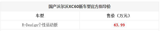 天翼汽车讯 近日获悉,国产沃尔沃XC60 R-Design个性运动版现已正式上市发售。据悉,采用大量R-Design套件的新车搭载了2.0T四缸涡轮增压发动机,售价为43.99万元,具体售价如下: