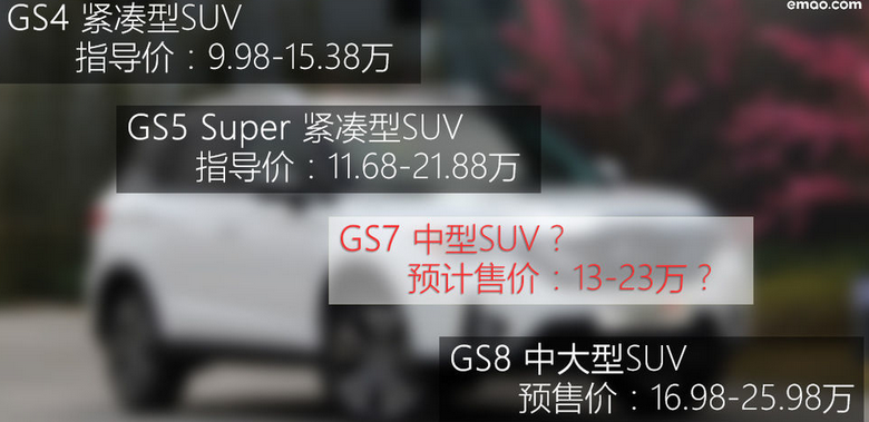 另外一款定位为中大型城市SUV的GS8,于9月初公布预售价格,为16.98-25.98万元区间。新车受到消费者的热切关注,也被视为突破中国品牌SUV价格天花板的种子选手。
