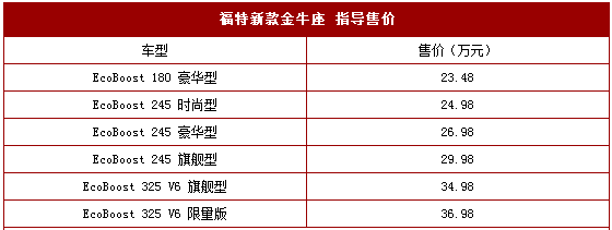 动力方面,新款金牛座提供1.5T(EcoBoost 180)、2.0T(EcoBoost 245)和2.7T(EcoBoost 325 V6)三款发动机选择,并全系匹配6速手自一体变速器。