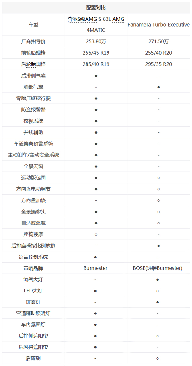 在配置对比中,奔驰S63L AMG除了没有配置膝部气囊、方向盘加热、前雾灯、后雨刷、后排座椅按比例放倒等功能,座椅按摩则作为选装件出现,在其它配置上奔驰S63L AMG还是处于领先位置。Panamera Turbo的配置不足则在比较当中显现出来,并且像零胎压继续行驶、夜视系统、车道偏离预警系统、语音控制系统、弯道辅助照明灯、后排液晶屏等并未配备,而且也没有选装的余地。