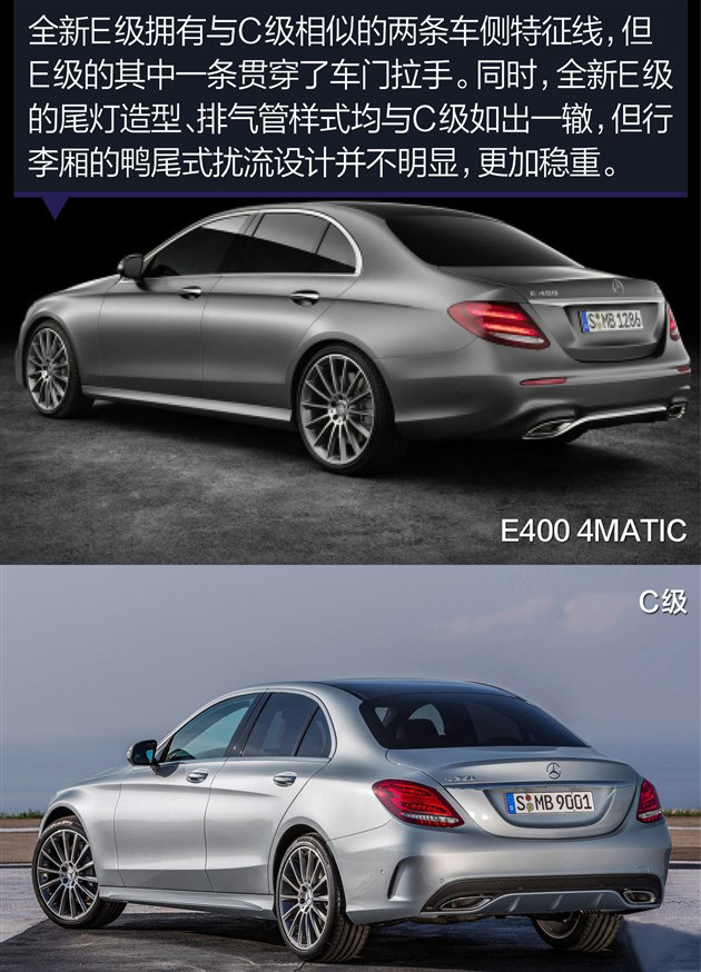 通过之前曝光的谍照,我们对全新E级的外观早已有一个轮廓,参考S级和C级即可。但看到官图之后,我们发现全新E级还是有一些自己独特地设计,比如向“四眼头灯”致敬的LED日间行车灯,不同的腰线和尾部设计。