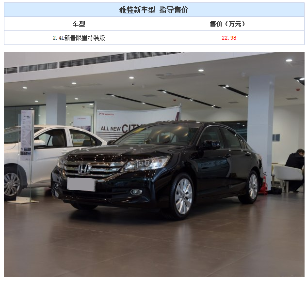 天翼汽车车讯 近日获悉,广汽本田推出一款雅阁2.4L新春限量特装版,新车型售价为22.98万元,限量发售3000台。