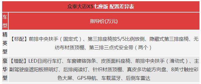据众泰官方消息,大迈X5七座版车型将于1月14日(明日)正式上市,新车将搭载1.5T发动机和5MT变速箱。根据之前的消息,该车预计售价在9万元左右。作为参考,现售的1.5T+5MT五座版车型售价区间为7.39万-10.89万元。