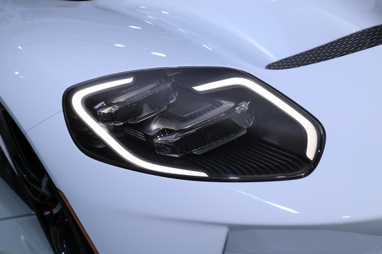 全新福特GT量产版整体采用了纯白色车身涂装,为了满足北美的法规要求,新车在前后保险杠的侧面配备有长条状的黄色反光板,同时,新车外后视镜尺寸相比原型车也有所增加。此外,该车大尺寸的双五辐轮圈进行了黑色的高光漆喷涂,尺寸较大的橘红色刹车卡钳更加突出了该车的运动感。