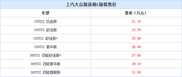 近日我们获悉,全新途观L共推出7款车型,上汽大众决定在本月22日正式公布新车3款2.0T车型售价,随后在下个月18日公布其余4款1...