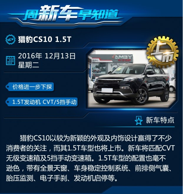 现在进入年底最后一个月了,本周有3款车型上市和1款车型首发亮相,数量不算多,新车分别是猎豹CS101.5T、沃尔沃S90长轴距版和...