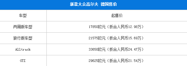 日前,大众官方正式公布了刚在洛杉矶车展上亮相的新款高尔夫在德国的售价,其中新款高尔夫两厢版车型起售价为17850欧元(约12...